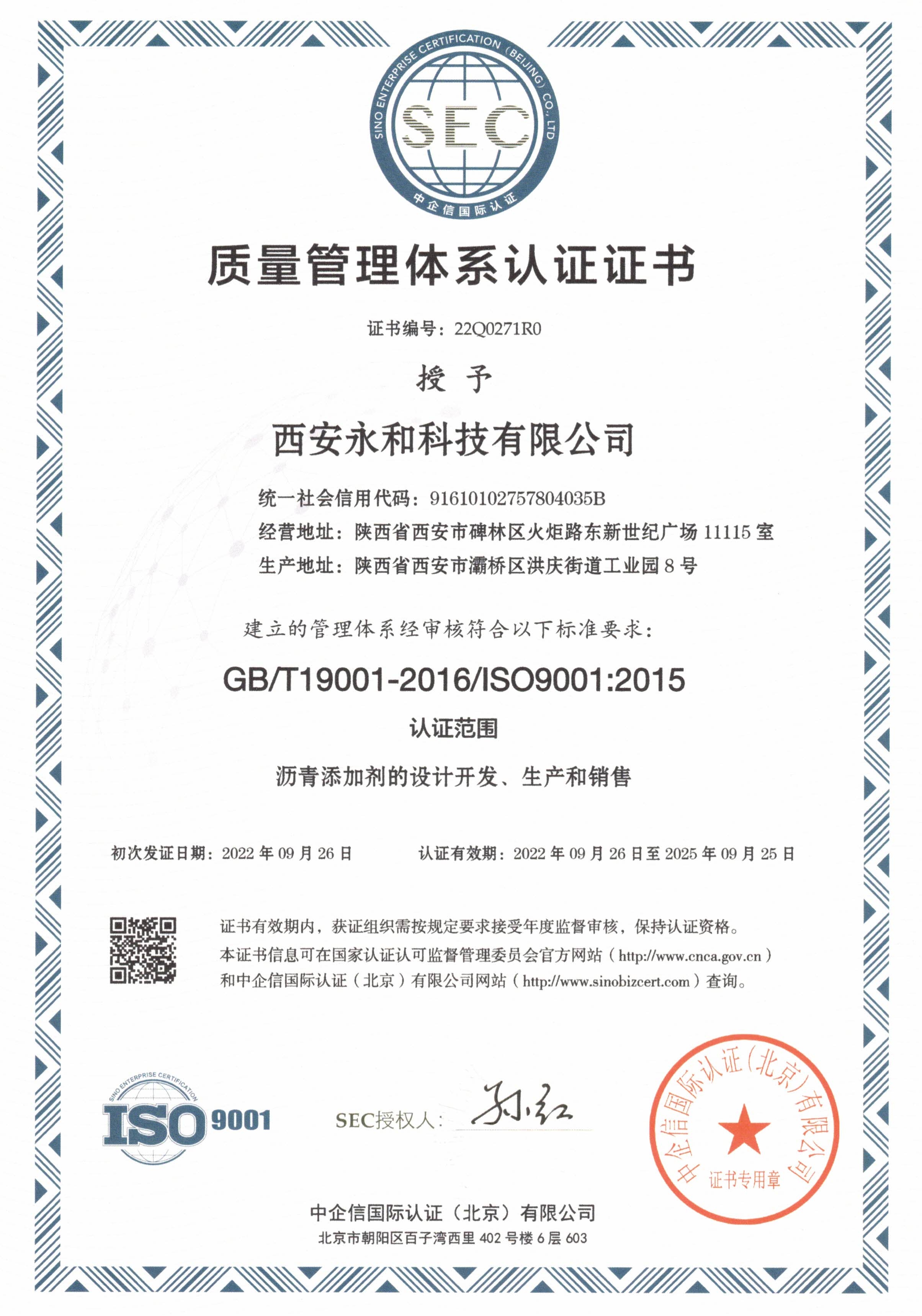 熱烈祝賀“西安永和科技有限公司”在2022年9月26日通過質量管理體系認定。